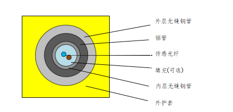 油井测温光缆是一种专业油井下温度监测、振动监测的一种传感光缆。光缆由内松套无 缝钢管、铝层、外厚壁无缝钢管和外护套四层结构组成,光纤采用耐氢损的碳+HT涂覆的 150℃中温光纤。产品具有很强的机械性能和密封性能, 适合用于 2000 米以上的常温井测温应用。